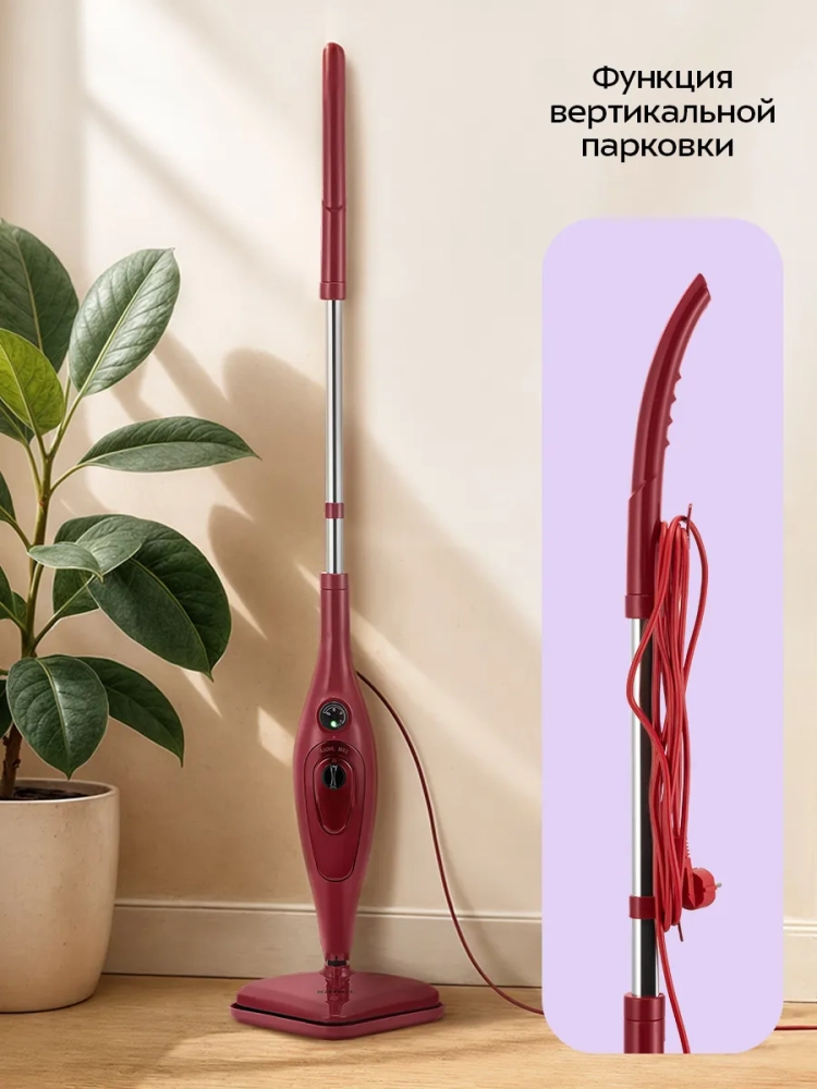 Паровая швабра обладает функцией вертикальной парковки и большим углом наклона при уборке. Напольная насадка закреплена на специальном шарнире, который делает швабру очень маневренной и облегчает уборку.