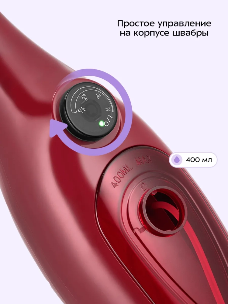 Устройство оснащено резервуаром для воды емкостью 400 мл, что позволяет производить непрерывную уборку до 13–22 минут в зависимости от интенсивности выходящего пара.