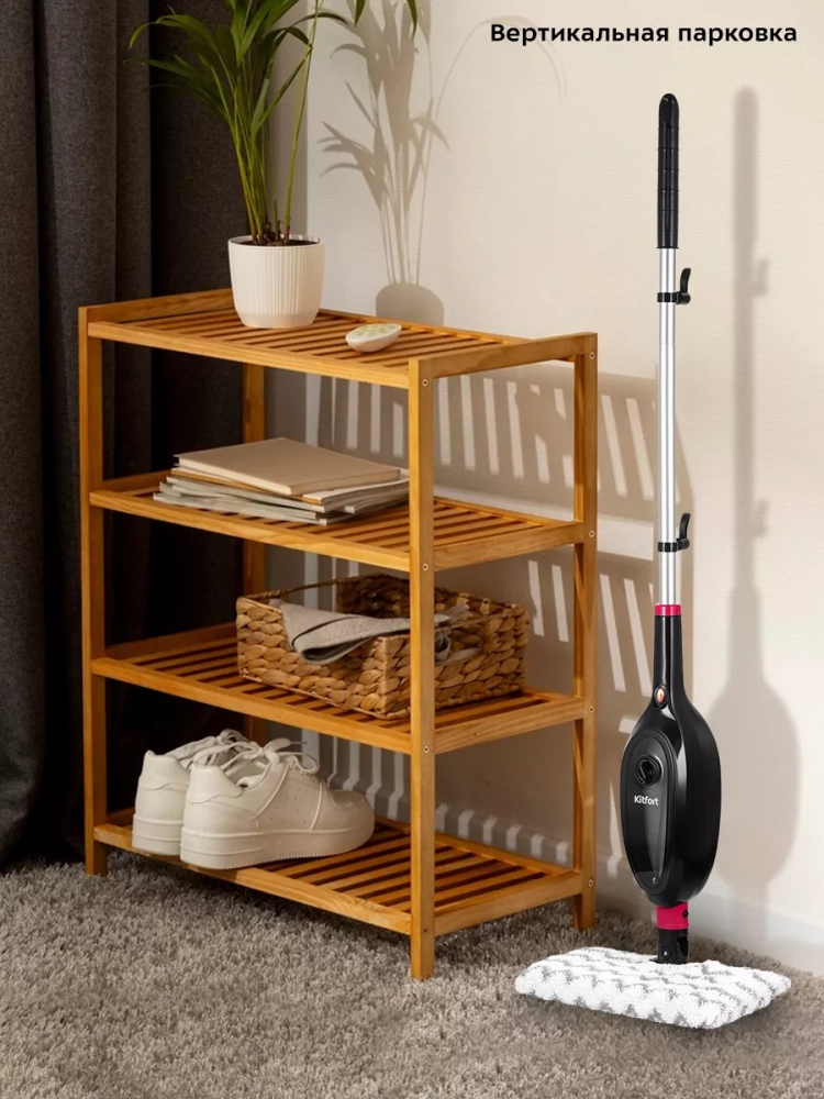 Паровая швабра обладает функцией вертикальной парковки и большим углом наклона при уборке, который поможет убрать пространство под мебелью. В устройстве предусмотрены держатели для шнура. Удлинительная трубка съемная, что обеспечивает компактное хранение.