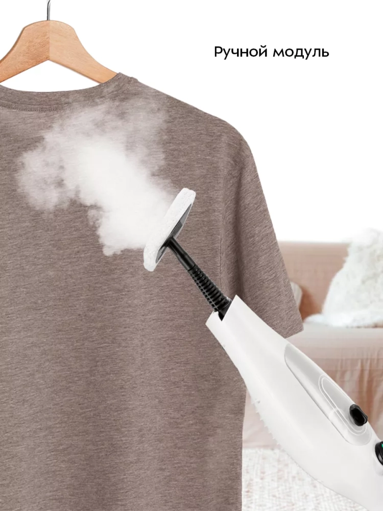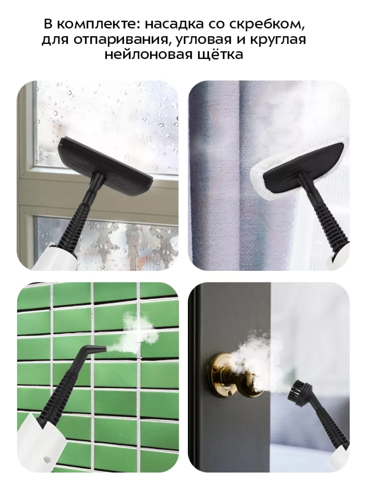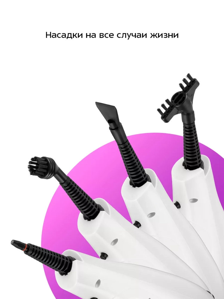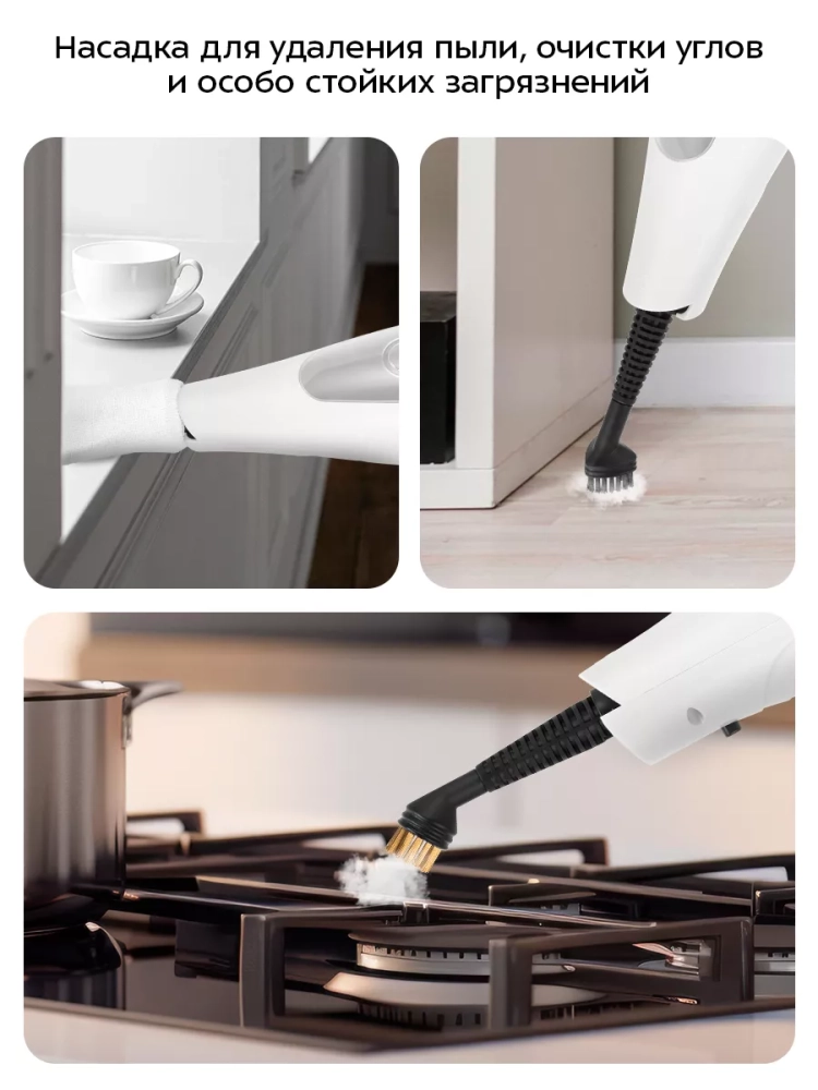 Конструкция «2 в 1» предусматривает использование ручного модуля паровой швабры с насадками без присоединения к нему удлинительной ручки. Большое количество насадок в комплекте поможет очистить труднодоступные или сильнозагрязненные поверхности. Скребок, латунная и нейлоновые щетки эффективно очищают сложные загрязнения с помощью механического воздействия. Для очистки окон, зеркал и кафельной плитки используется насадка с резиновым скребком. Если на данную насадку надеть тряпку для отпаривания, насадка с резиновым скребком может использоваться для отпаривания одежды и чистки обивки мягкой мебели. Струйная и угловая насадки помогут очистить щели и углы. С помощью мерного стакана из комплекта удобно заполнять резервуар для воды. Спица для чистки предназначена для удаления загрязнений в паровом сопле ручного модуля и насадок.