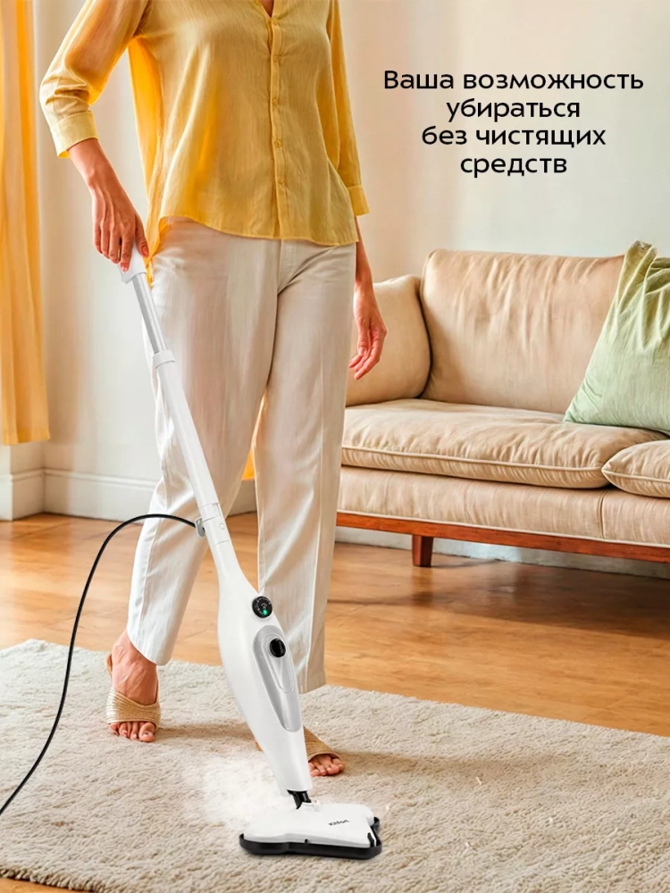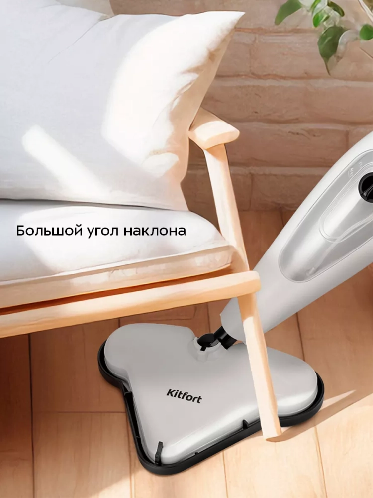Паровая швабра обладает функцией вертикальной парковки и большим углом наклона при уборке, который поможет убрать пространство под мебелью. Удлинительная ручка съемная, что обеспечивает компактное хранение.