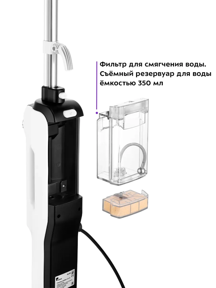 Паровая швабра Kitfort КТ-1019 оснащена съемным резервуаром для воды емкостью 350 мл, что позволяет производить непрерывную уборку от 12 до 25 минут в зависимости от выбранного уровня подачи пара.