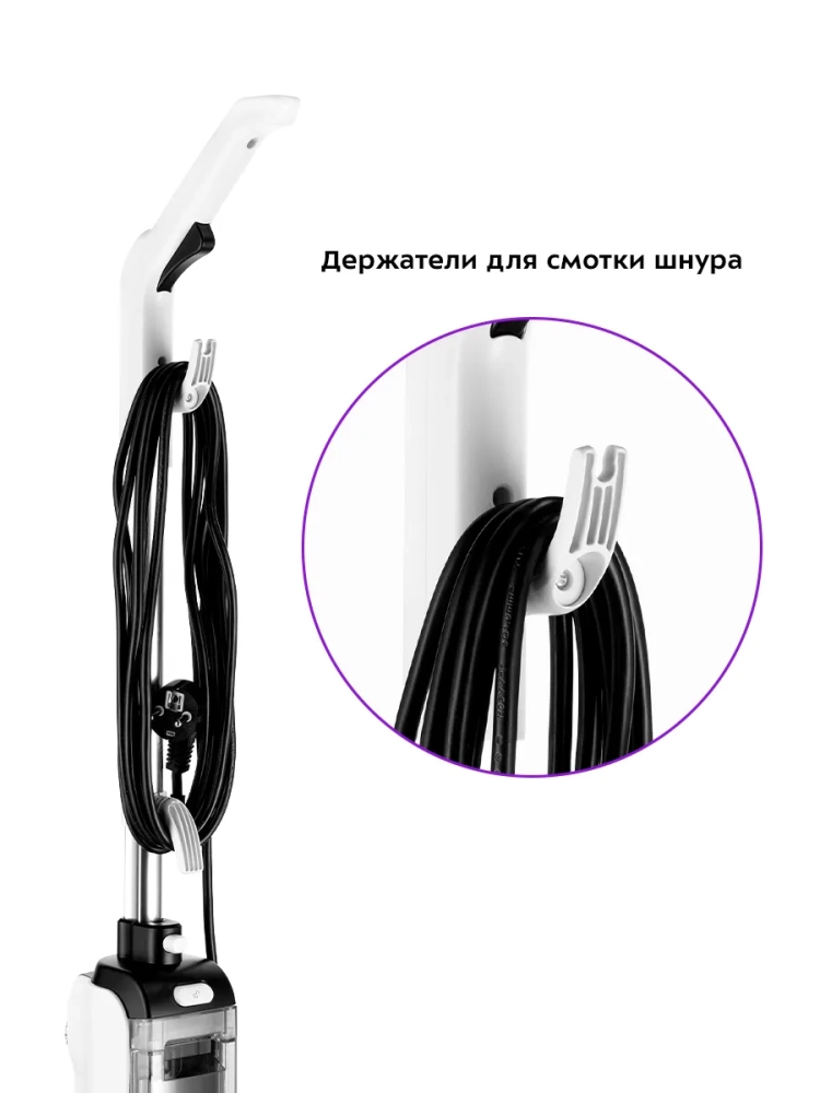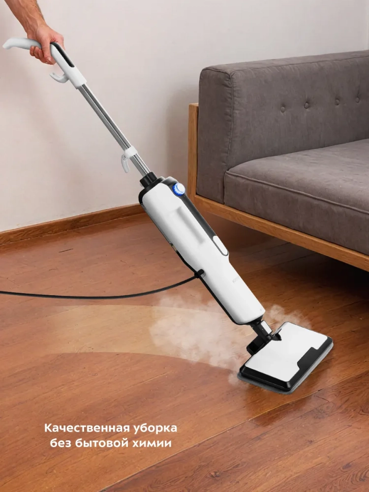 Паровая швабра обладает функцией вертикальной парковки и большим углом наклона при уборке, который поможет легко убирать пространство под мебелью.