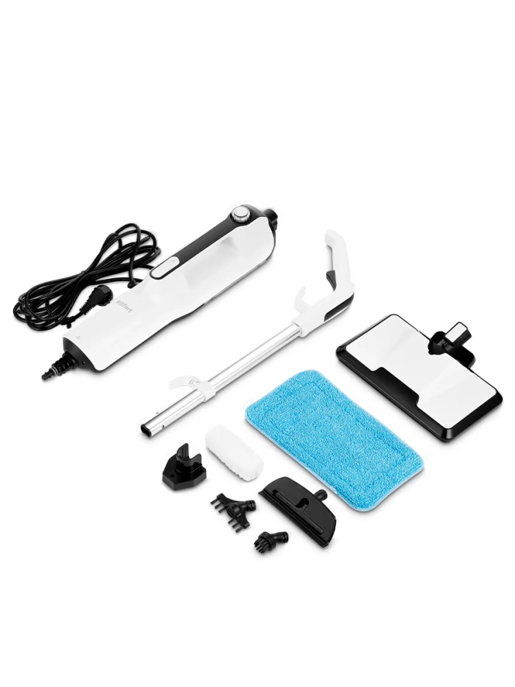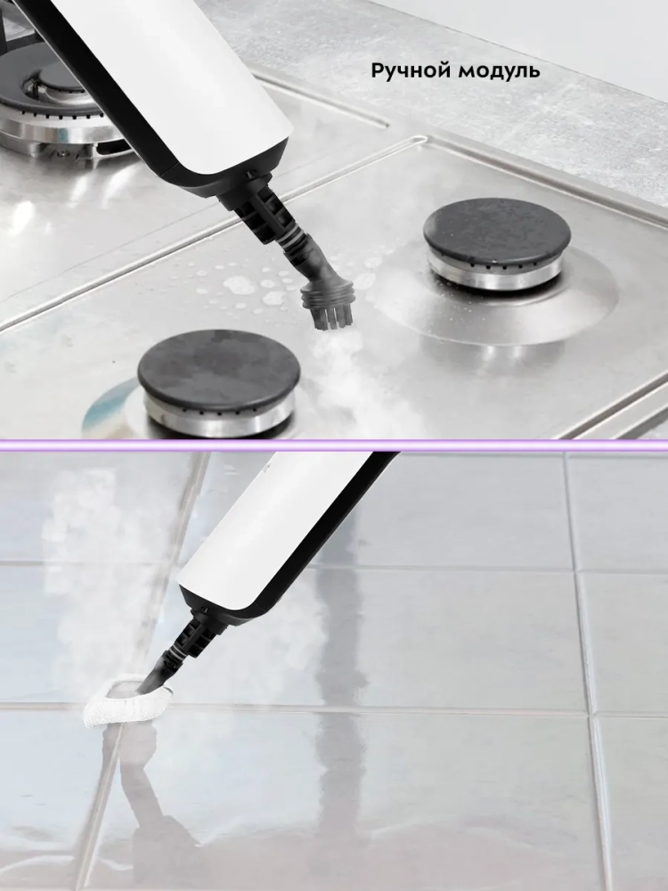 Конструкция «2 в 1» предусматривает наличие ручного модуля, который удобно использовать с насадками. С помощью насадок можно очистить большинство вещей в доме: легко отмыть окна, почистить шторы и мягкую мебель. Плоская и круглая нейлоновые щетки эффективно очищают сложные загрязнения с помощью механического воздействия. Для очистки окон, зеркал и кафельной плитки предусмотрена специальная насадка для отпаривания со скребком. Ее можно использовать с тряпкой для отпаривания, чтобы отпаривать одежду и чистить обивку мягкой мебели.