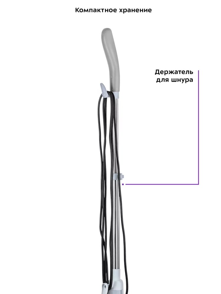 Паровая швабра обладает функцией вертикальной парковки и большим углом наклона при уборке, что позволяет легко убирать пространство под мебелью. Напольная щетка закреплена на специальном шаровом шарнире с наклоном в двух плоскостях, что делает швабру очень маневренной и облегчает процесс уборки. На удлинительной ручке предусмотрены держатели для шнура.