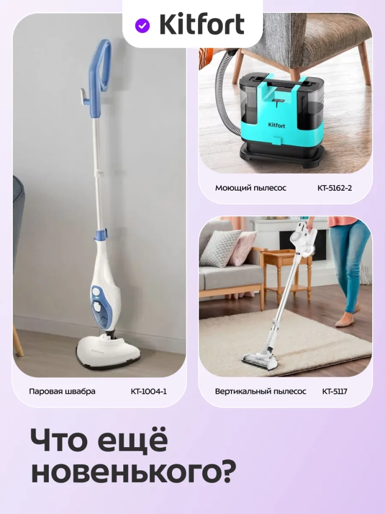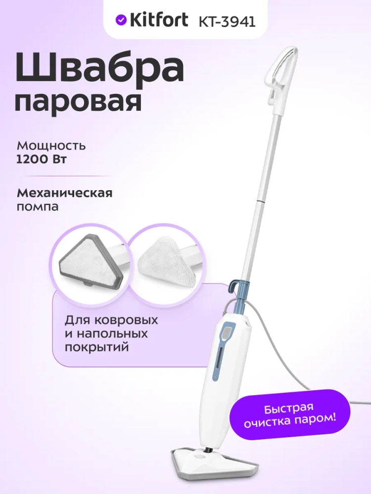 Паровая швабра Kitfort КТ-3941 —устройство, которое поможет избавиться от пыли и грязи с помощью мощной струи пара, а также продезинфицирует обрабатываемую поверхность. Данный прибор очистит напольные покрытия без каких-либо химических средств — исключительно паром, поэтому он станет оптимальным решением для аллергиков.