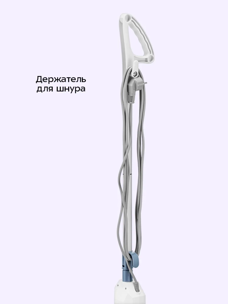 Паровая швабра обладает функцией вертикальной парковки и большим углом наклона, который поможет убрать пространство под мебелью. В комплекте есть рамка для ковра, обеспечивающая легкое скольжение напольной насадки по ковру. В устройстве предусмотрены держатели для шнура питания.