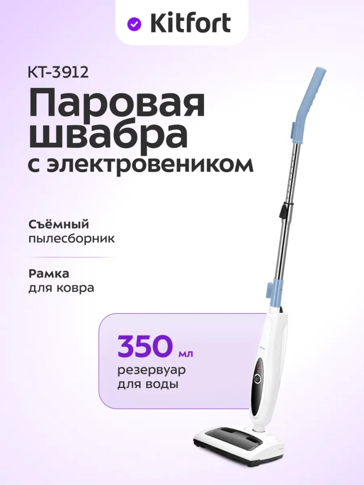 Паровая швабра с электровеником Kitfort КТ-3912 — универсальное устройство, которое совмещает себе функции паровой швабры и электровеника. Прибор поможет быстро избавиться от мусора и пыли, а также очистить и продезинфицировать напольные покрытия без каких-либо химических средств — исключительно паром.