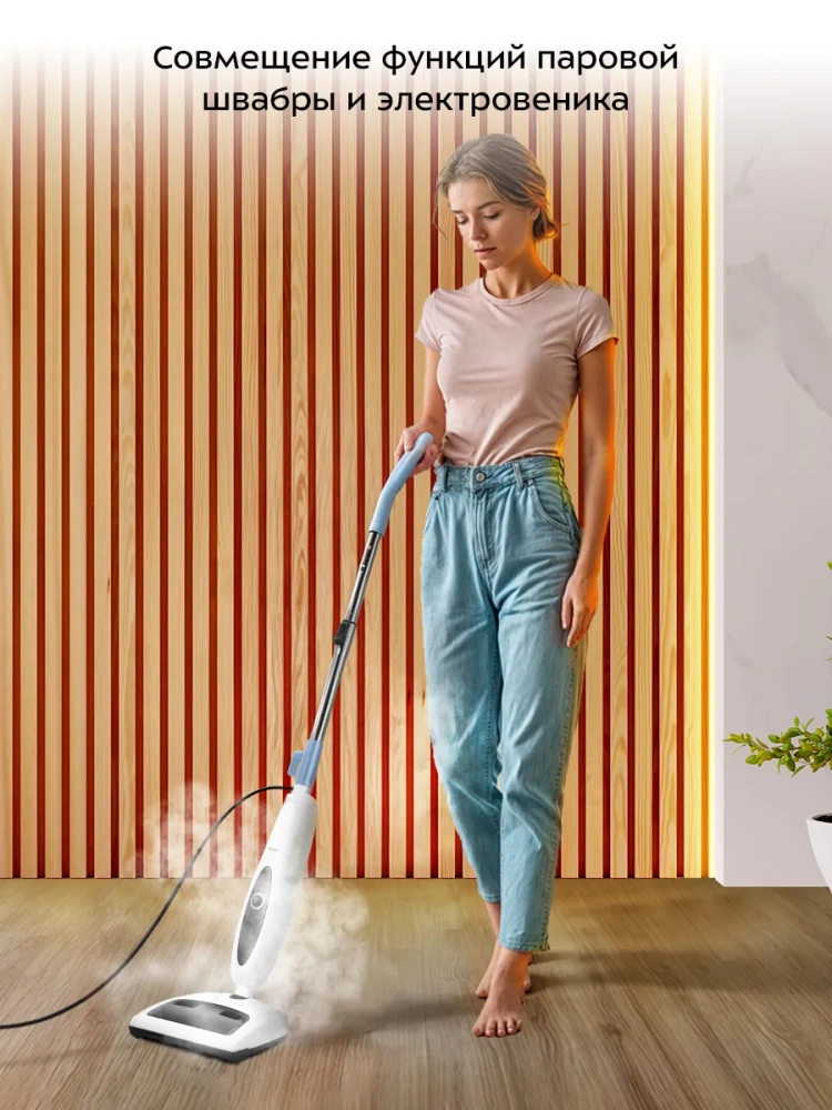 Паровая швабра обладает функцией вертикальной парковки и большим углом наклона, который поможет убрать пространство под мебелью. В комплекте есть рамка для ковра, обеспечивающая легкое скольжение напольной щетки по ковру. Телескопическая удлинительная трубка позволяет регулировать ее длину так, как вам удобно. В устройстве предусмотрены держатели для шнура. В комплекте предусмотрен коврик для защиты напольного покрытия во время нагрева устройства и перерывов в уборке.