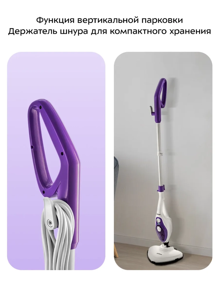Паровая швабра оснащена парогенератором мощностью 1500 Вт, который обеспечивает высокую температуру пара для глубокой очистки и дезинфекции поверхностей. Пар проникает вглубь загрязнений, размягчая и растворяя их, что позволяет легко удалять грязь с помощью микрофибры или щетки. В комплект входят различные насадки, включая скребок для окон и ворсовые щетки, что расширяет возможности использования устройства.