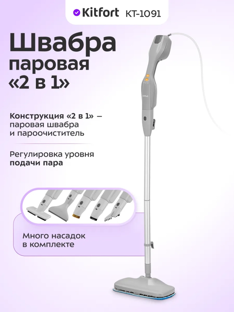 Электрическая паровая швабра Kitfort КТ-1091 — это мощная парошвабра, предназначенная для эффективной уборки и мытья полов. С мощностью 2000 Вт, эта швабра обеспечивает быстрое и качественное очищение различных поверхностей. Паровая швабра Kitfort оснащена разнообразными насадками, которые позволяют адаптировать устройство для различных типов полов и задач уборки.