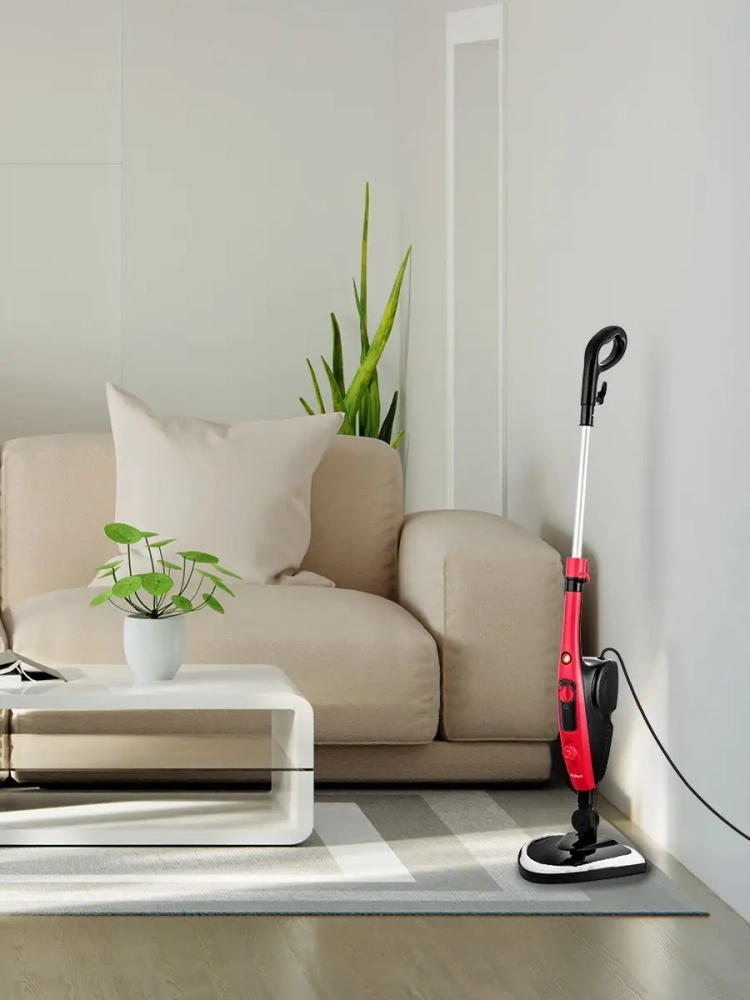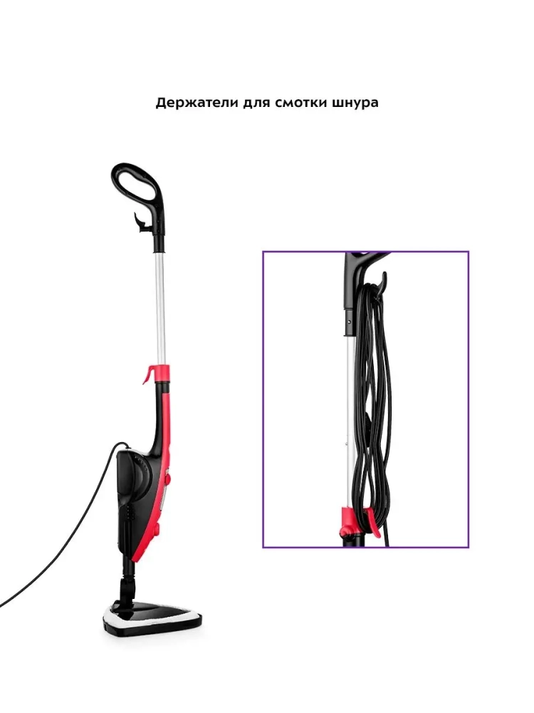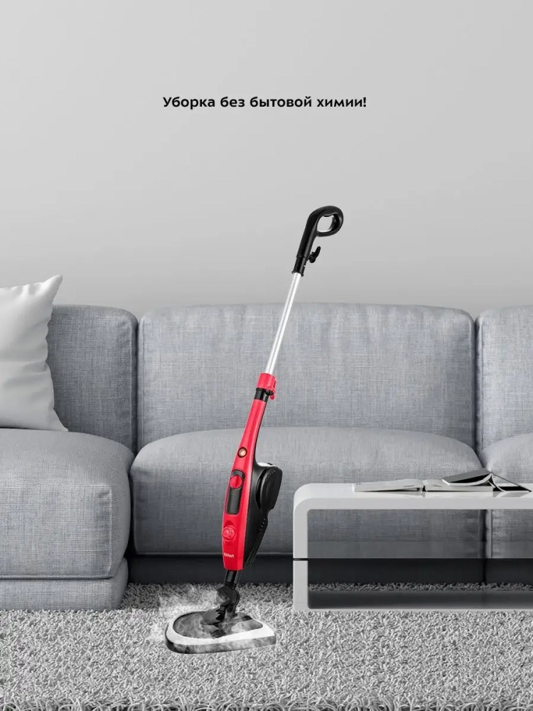 Паровая швабра обладает функцией вертикальной парковки и большим углом наклона при уборке, который поможет легко убирать пространство под мебелью. Напольная щетка закреплена на специальном шаровом шарнире с наклоном в двух плоскостях, что делает швабру очень маневренной и облегчает уборку.