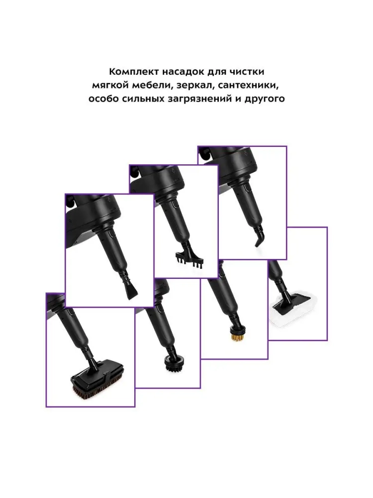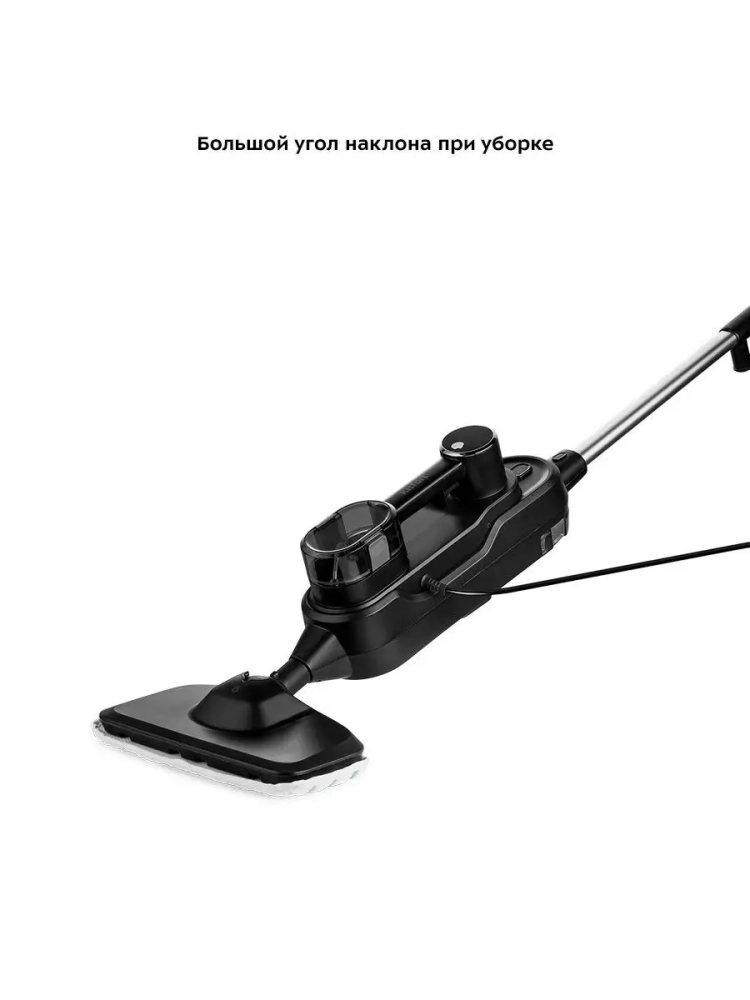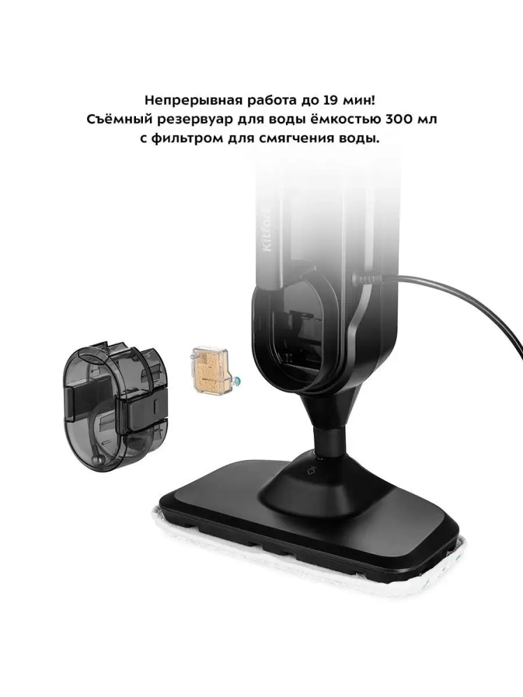 Паровая швабра «2 в 1» Kitfort КТ-1018 — универсальное устройство, которое поможет избавиться от пыли и грязи с помощью мощной струи пара, а также продезинфицирует обрабатываемую поверхность. Устройство оснащено резервуаром для воды емкостью 300 мл, что позволяет производить непрерывную уборку до 19 минут. Принцип действия паровой швабры основан на воздействии горячего пара на загрязнения. Пар проникает внутрь загрязнения, размягчая и растворяя его, а затем с помощью тряпки частички грязи смываются. Нерастворимое в воде загрязнение (например, жировое отложение) удаляется аналогичным образом: под действием высокой температуры пара оно размягчается, а пар вместе с механическим воздействием на загрязнение превращает его в эмульсию, состоящую из мелких частичек загрязнения и воды. Эта эмульсия затем может быть легко удалена тряпкой. Во время работы паровой швабры вода из резервуара, проходя через фильтр для смягчения воды, подается в бойлер помпой (водяным насосом). Для паровой швабры не нужны чистящие средства, поэтому она станет идеальным решением для уборки дома для аллергиков. Однако с помощью паровой швабры КТ-1018 можно проводить очистку пола и с моющим средством, для этого устройство оснащено резервуаром для моющего средства емкостью 150 мл. В комплекте есть рамка для ковра, которая обеспечивает легкое скольжение щетки для пола по ковру. Конструкция «2 в 1» предусматривает наличие ручного модуля, который удобно использовать с насадками. С помощью насадок легко отмыть окна, почистить шторы и мягкую мебель. Скребок, латунная и нейлоновые щетки эффективно очищают сложные загрязнения с помощью механического воздействия. Для очистки окон, зеркал и кафельной плитки используется скребок для стекла с резиновой вставкой. В комплекте есть насадка для отпаривания с тряпкой для отпаривания, чтобы отпаривать одежду и чистить обивку мягкой мебели. Ворсовая щетка используется, чтобы счищать шерсть с отпариваемых вещей. Струйная и угловая насадки помогут очистить щели и углы.