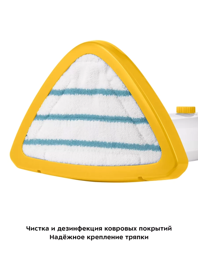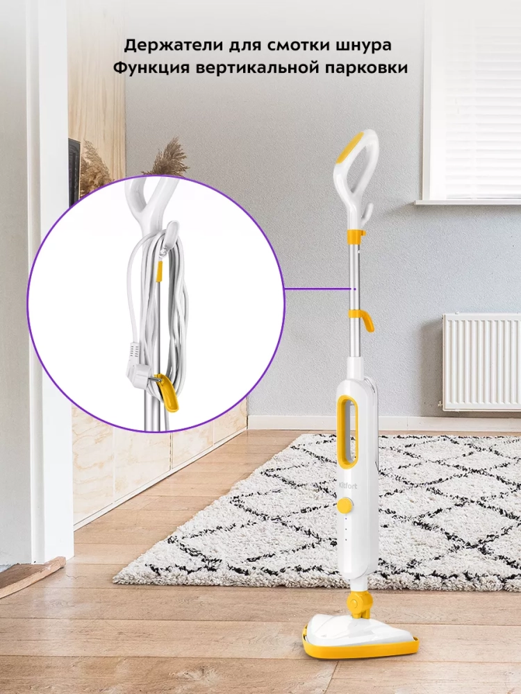 Паровая швабра обладает функцией вертикальной парковки и большим углом наклона при уборке, который поможет легко убирать пространство под мебелью. Напольная щетка закреплена на специальном шаровом шарнире с наклоном в двух плоскостях, что делает швабру очень маневренной и облегчает уборку. Также у паровой швабры предусмотрены держатели для шнура.