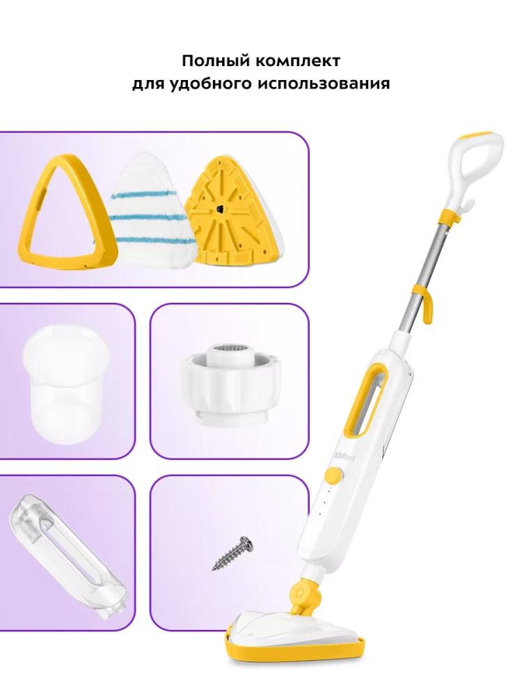 Паровая швабра Kitfort КТ-1048 — универсальное устройство, которое поможет избавиться от пыли и грязи с помощью мощной струи пара, а также продезинфицирует обрабатываемую поверхность. Устройство оснащено резервуаром для воды емкостью 360 мл, что позволяет производить непрерывную уборку 13–20 минут.