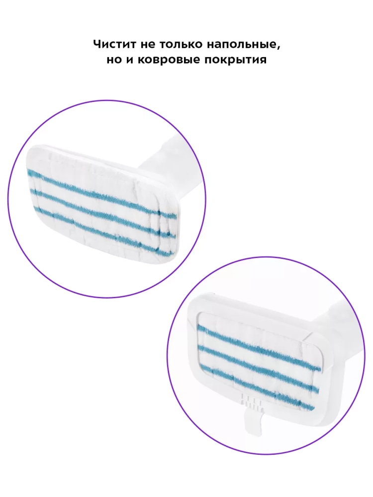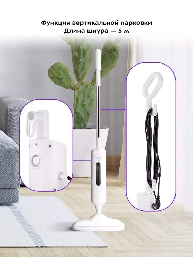Паровая швабра обладает функцией вертикальной парковки и большим углом наклона при уборке, который поможет легко убирать пространство под мебелью. Напольная щетка закреплена на специальном шаровом шарнире с наклоном в двух плоскостях, что делает швабру очень маневренной и облегчает уборку. На удлинительной трубке с ручкой предусмотрены держатели для шнура.