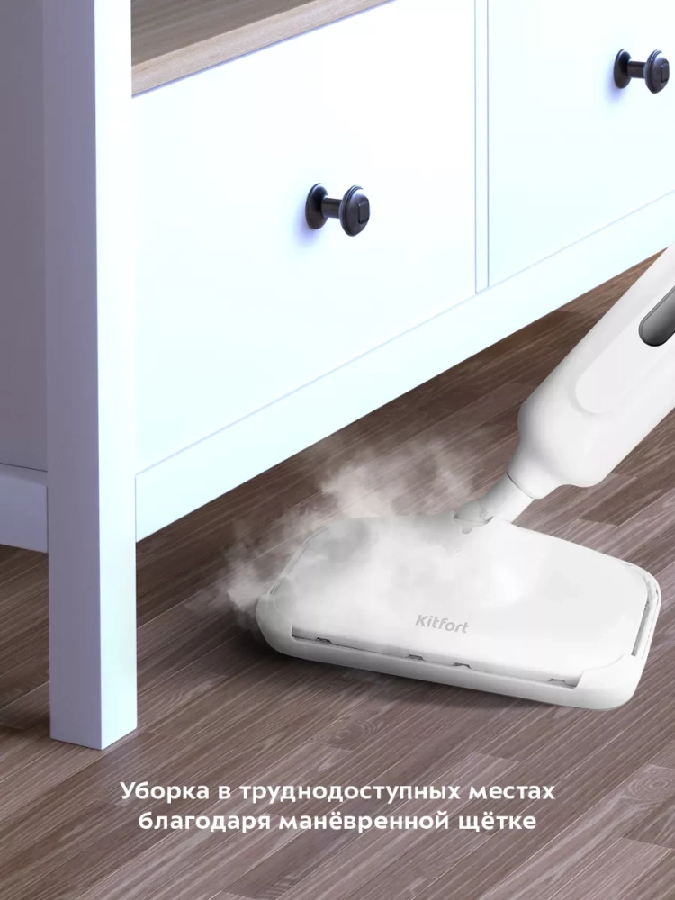 Паровая швабра Kitfort КТ-1052 — универсальное устройство, которое поможет избавиться от пыли и грязи с помощью мощной струи пара, а также продезинфицирует обрабатываемую поверхность.
