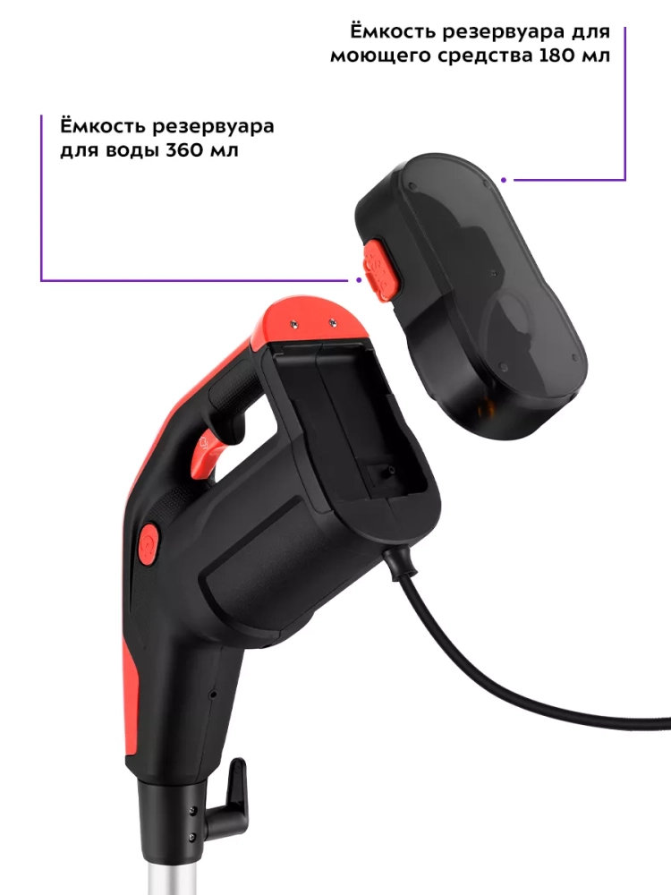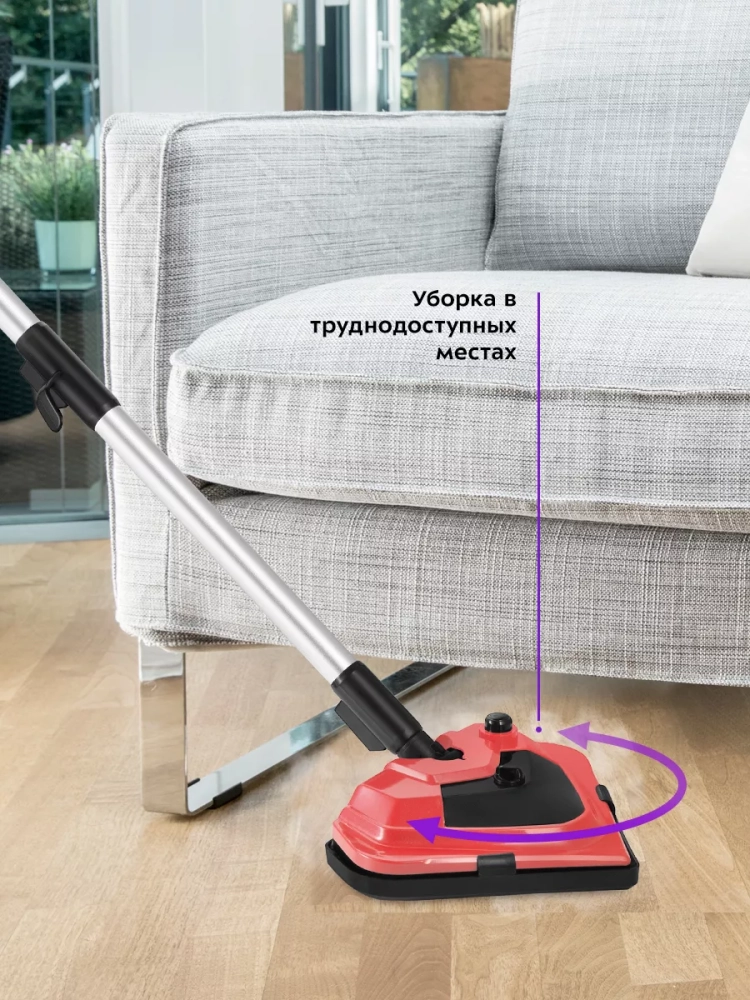 Паровая швабра обладает большим углом наклона при уборке, который поможет легко убирать пространство под мебелью. Напольная щетка закреплена на специальном шаровом шарнире с наклоном в двух плоскостях, что делает швабру очень маневренной и облегчает уборку. На удлинительной ручке предусмотрены держатели для шнура.