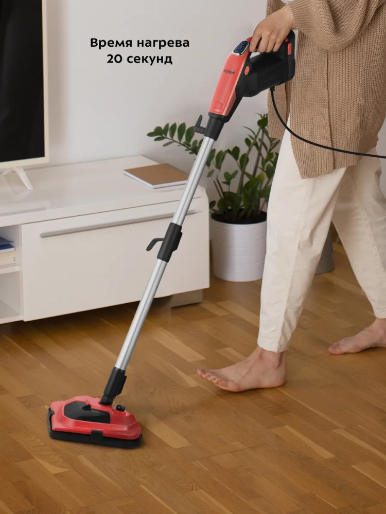 Принцип действия паровой швабры основан на воздействии горячего пара на загрязнения. Пар проникает внутрь загрязнения, размягчая и растворяя его, а затем с помощью тряпки частички грязи смываются. Для паровой швабры не нужны чистящие средства, поэтому она станет идеальным решением для уборки дома для аллергиков. В комплекте есть рамка для ковра, которая обеспечивает легкое скольжение щетки для пола по ковру.