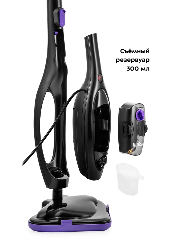 Паровая швабра Kitfort КТ-1061 — универсальное устройство, которое поможет избавиться от пыли и грязи с помощью мощной струи пара, а также продезинфицирует обрабатываемую поверхность. Паровая швабра очистит раковину и плиту на кухне, зеркала и мебель без каких-либо химических средств, исключительно паром.
