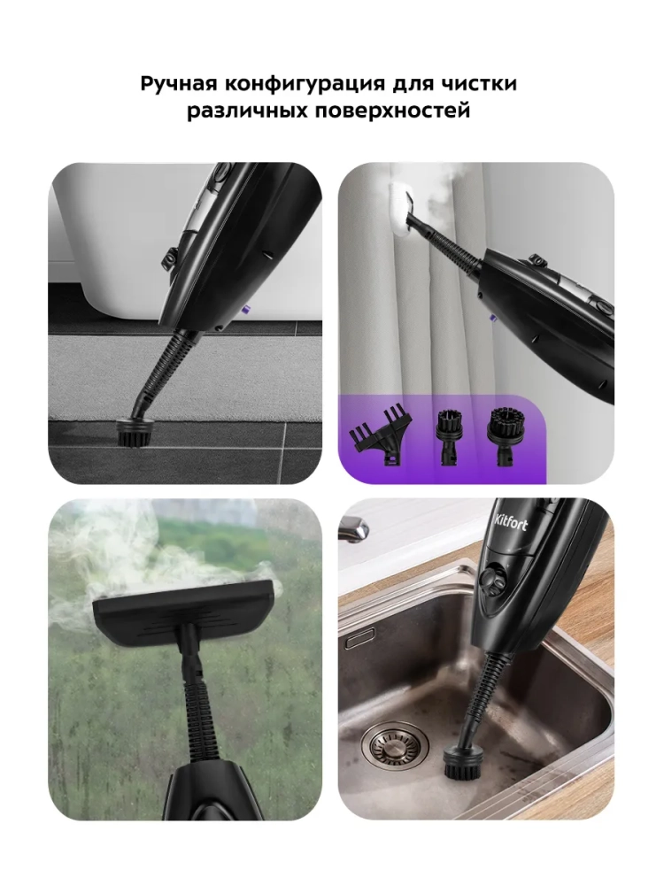 Конструкция «2 в 1» предусматривает наличие ручного модуля, который удобно использовать с насадками. С помощью насадок можно очистить большинство вещей в доме: легко отмыть окна, почистить шторы и мягкую мебель. Плоская и круглые нейлоновые щетки эффективно очищают сложные загрязнения с помощью механического воздействия. Для очистки окон, зеркал и кафельной плитки предусмотрена специальная насадка для отпаривания с резиновым скребком. Ее можно использовать с тряпкой для отпаривания, чтобы отпаривать одежду и чистить обивку мягкой мебели.