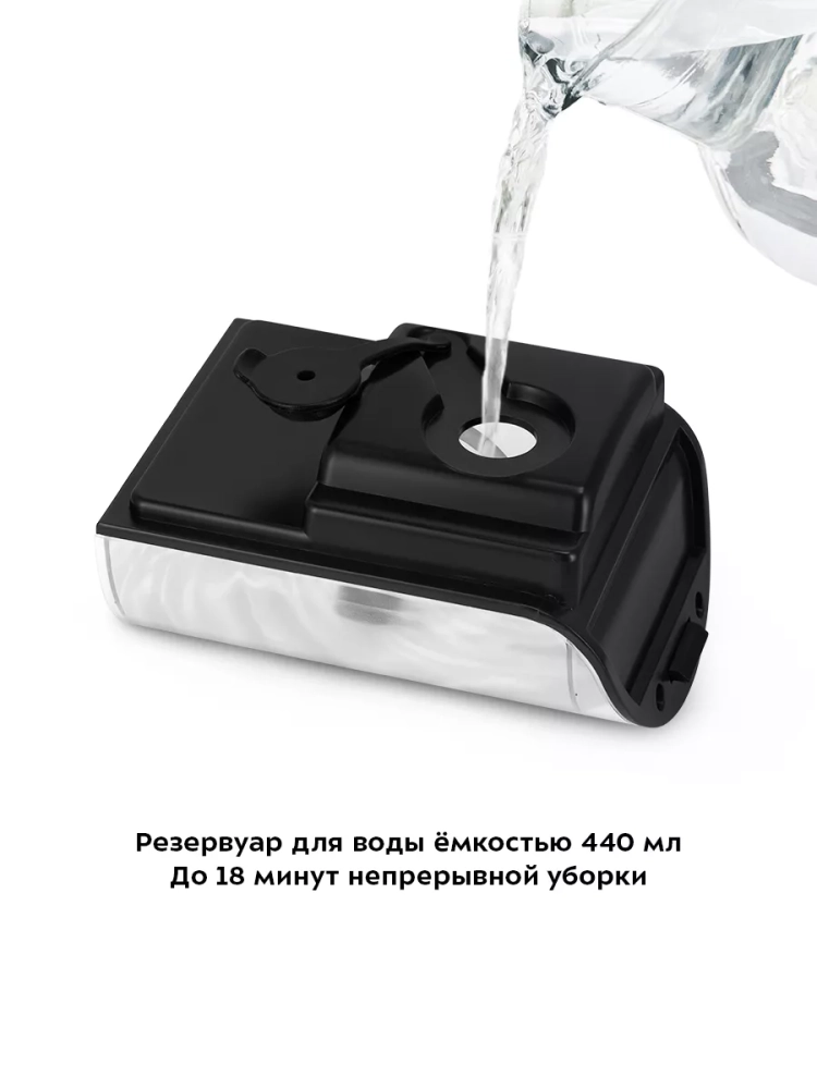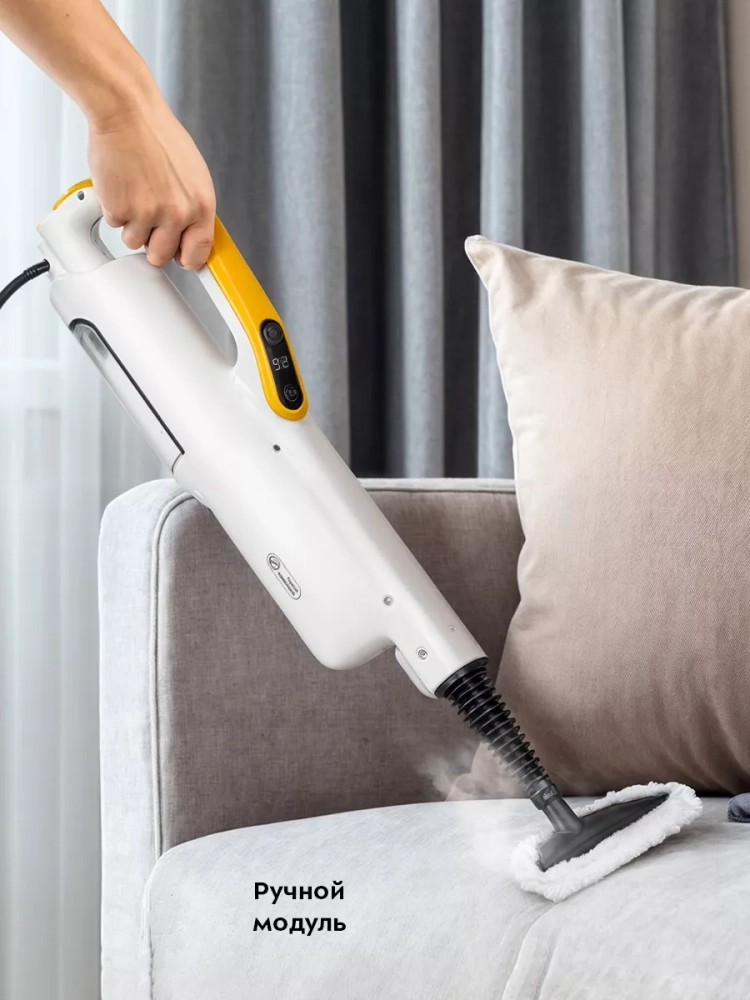 Швабра оснащена системой защиты от случайного включения при использовании ручного модуля без удлинительной трубки. Подача пара будет происходить только, если вы крепко держите прибор за ручку.