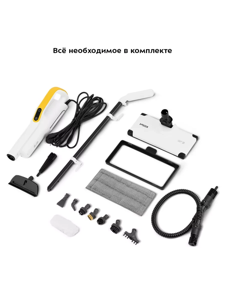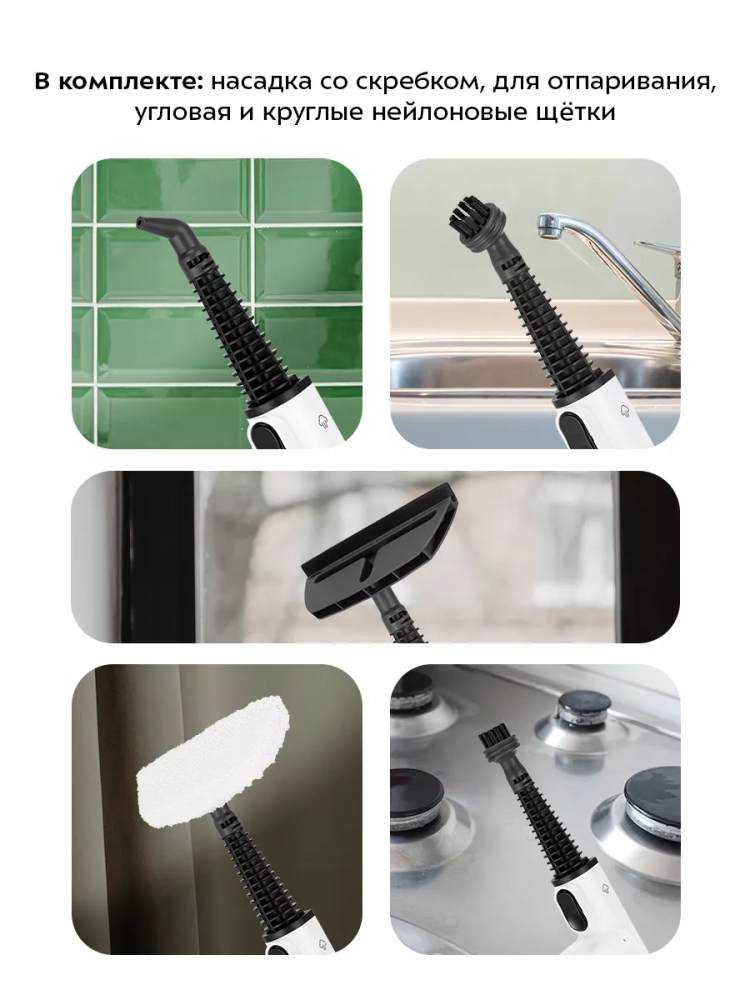 Конструкция «2 в 1» предусматривает наличие ручного модуля, который удобно использовать с насадками. С помощью насадок легко отмыть окна, отпарить шторы и почистить мягкую мебель. Скребок, латунная и нейлоновые щетки эффективно очищают сложные загрязнения с помощью механического воздействия. В комплекте есть насадка для отпаривания с тряпкой для отпаривания, чтобы отпаривать одежду и чистить обивку мягкой мебели. На насадке для отпаривания предусмотрен резиновый скребок для очистки окон, зеркал и кафельной плитки. Струйная и угловая насадки помогут очистить щели и углы. Благодаря наличию парового шланга есть возможность добраться и очистить труднодоступные места.