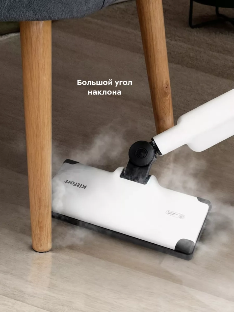 Конструкция паровой швабры обеспечивает большой угол наклона при уборке, что позволяет легко убирать пространство под мебелью. Насадка для пола закреплена на специальном шарнире с наклоном в двух плоскостях, что делает швабру очень маневренной и облегчает уборку. На удлинительной трубке предусмотрены держатели для шнура.