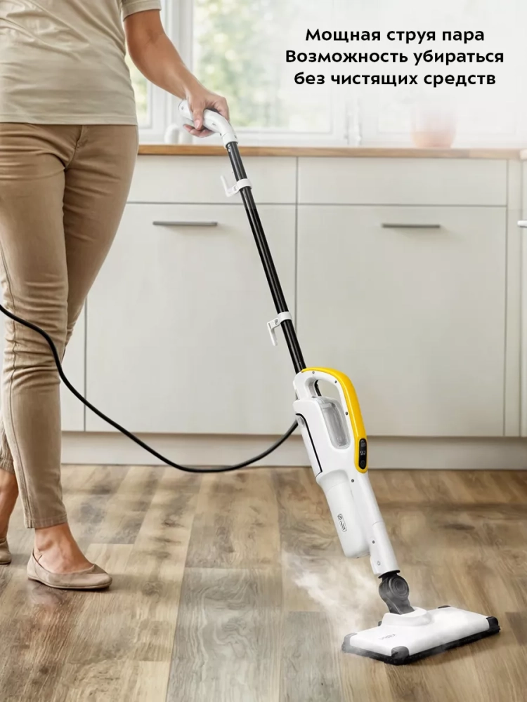 Принцип действия паровой швабры основан на воздействии горячего пара на загрязнения. Пар проникает внутрь загрязнения, размягчая и растворяя его, а затем с помощью тряпки частички грязи смываются. Для паровой швабры не нужны чистящие средства, поэтому она станет идеальным решением для уборки дома для аллергиков. В комплекте есть рамка для ковра, которая обеспечивает легкое скольжение насадки для пола по ковру.