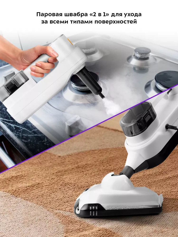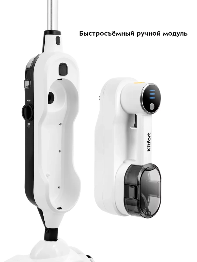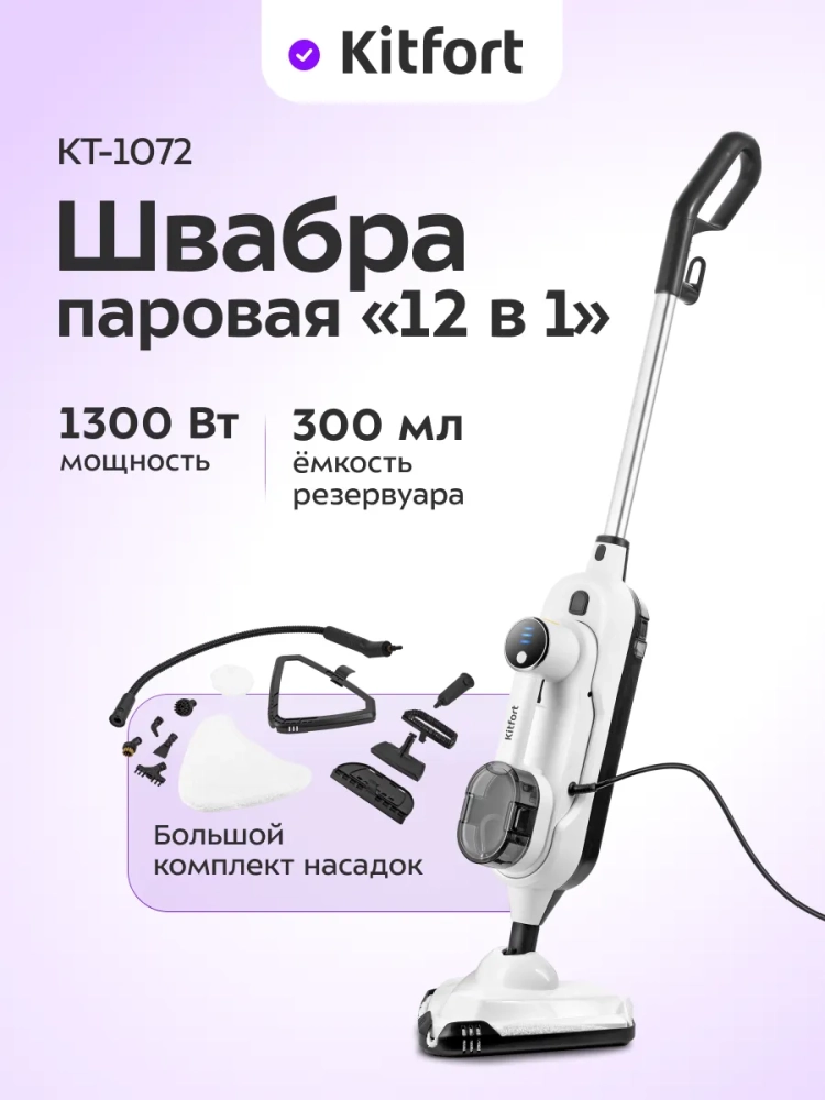 Паровая швабра Kitfort КТ-1072 (2 в 1) — универсальное устройство, которое поможет избавиться от пыли и грязи с помощью мощной струи пара, а также продезинфицирует обрабатываемую поверхность. Устройство оснащено резервуаром для воды емкостью 300 мл, что позволяет производить непрерывную уборку до 19 минут.