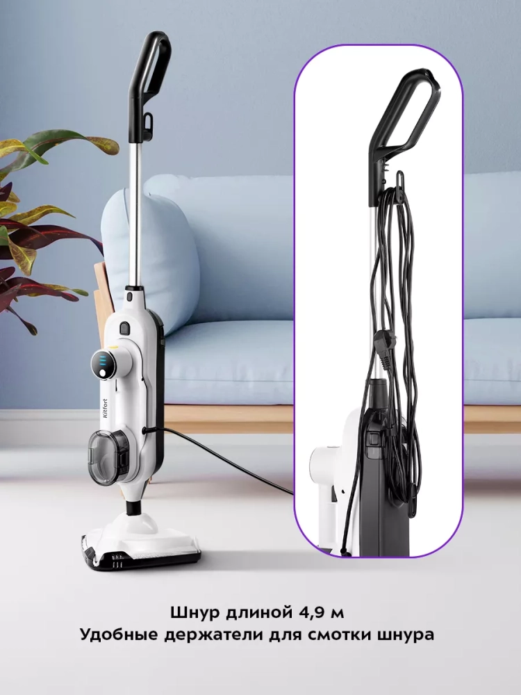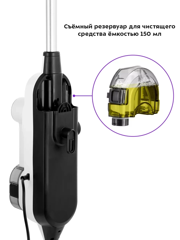 Паровая швабра обладает функцией вертикальной парковки и большим углом наклона при уборке, который поможет легко убирать пространство под мебелью. Напольная щетка закреплена на специальном шаровом шарнире с наклоном в двух плоскостях, что делает швабру очень маневренной и облегчает уборку. На паровой швабре предусмотрены держатели для шнура.