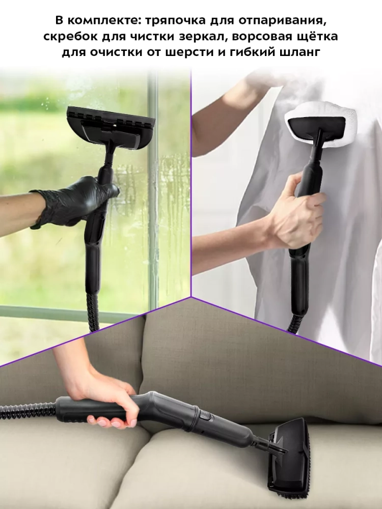 Конструкция «2 в 1» предусматривает наличие ручного модуля, который удобно использовать с насадками. С помощью насадок легко отмыть окна, почистить шторы и мягкую мебель. Скребок, латунная и нейлоновые щетки эффективно очищают сложные загрязнения с помощью механического воздействия. Для очистки окон, зеркал и кафельной плитки используется скребок для стекла с резиновой вставкой. В комплекте есть насадка для отпаривания с тряпкой для отпаривания, чтобы отпаривать одежду и чистить обивку мягкой мебели. Ворсовая щетка используется, чтобы счищать шерсть с отпариваемых вещей. Струйная и угловая насадки помогут очистить щели и углы. Благодаря наличию парового шланга есть возможность добраться и очистить труднодоступные места.