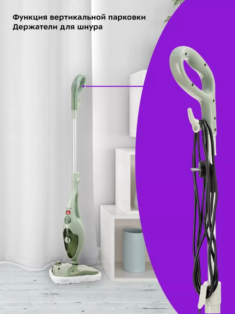 Паровая швабра обладает функцией вертикальной парковки и большим углом наклона, который поможет легко убирать пространство под мебелью. Напольная насадка закреплена на специальном шаровом шарнире с наклоном в двух плоскостях, что делает швабру очень маневренной и облегчает уборку. Также у паровой швабры предусмотрены держатели для шнура.