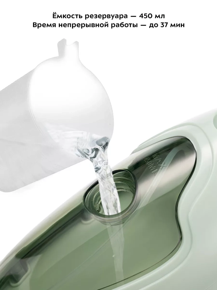 Устройство оснащено резервуаром для воды емкостью 450 мл, что позволяет производить непрерывную уборку 14–37 минут.