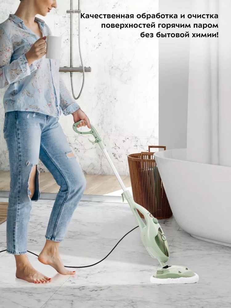 Принцип действия паровой швабры основан на воздействии горячего пара на загрязнения. Для паровой швабры не нужны чистящие средства, поэтому она станет идеальным решением уборки дома для аллергиков. В комплекте предусмотрена рамка для ковра, которая обеспечивает легкое скольжение насадки для пола по ковру.