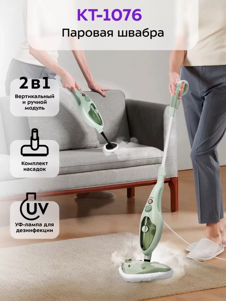 Паровая швабра Kitfort КТ-1076 — универсальное устройство, которое поможет избавиться от пыли и грязи с помощью мощной струи пара, а также продезинфицирует обрабатываемую поверхность. КТ-1076 очистит напольные покрытия, раковину и плиту на кухне, зеркала, окна и плитку в ванной без каких-либо химических средств, исключительно паром.