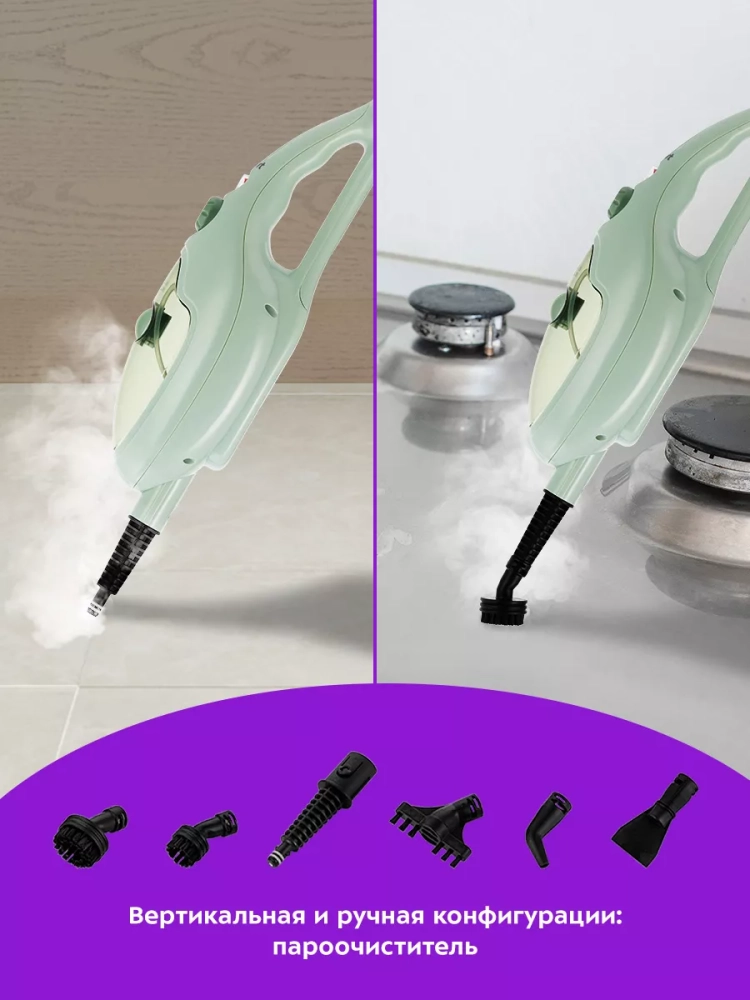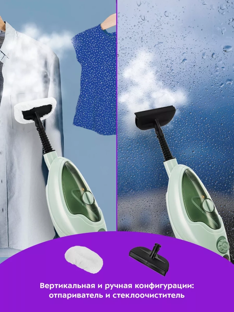 Конструкция «2 в 1» предусматривает наличие ручного модуля, который удобно использовать с насадками. С помощью насадок можно очистить большинство вещей в доме: легко отмыть окна, отпарить шторы и мягкую мебель. Нейлоновые щетки эффективно очищают сложные загрязнения с помощью механического воздействия. Для очистки окон, зеркал и кафельной плитки предусмотрена специальная насадка для отпаривания со скребком. Ее можно использовать с тряпкой для отпаривания, чтобы отпаривать одежду и чистить обивку мягкой мебели.