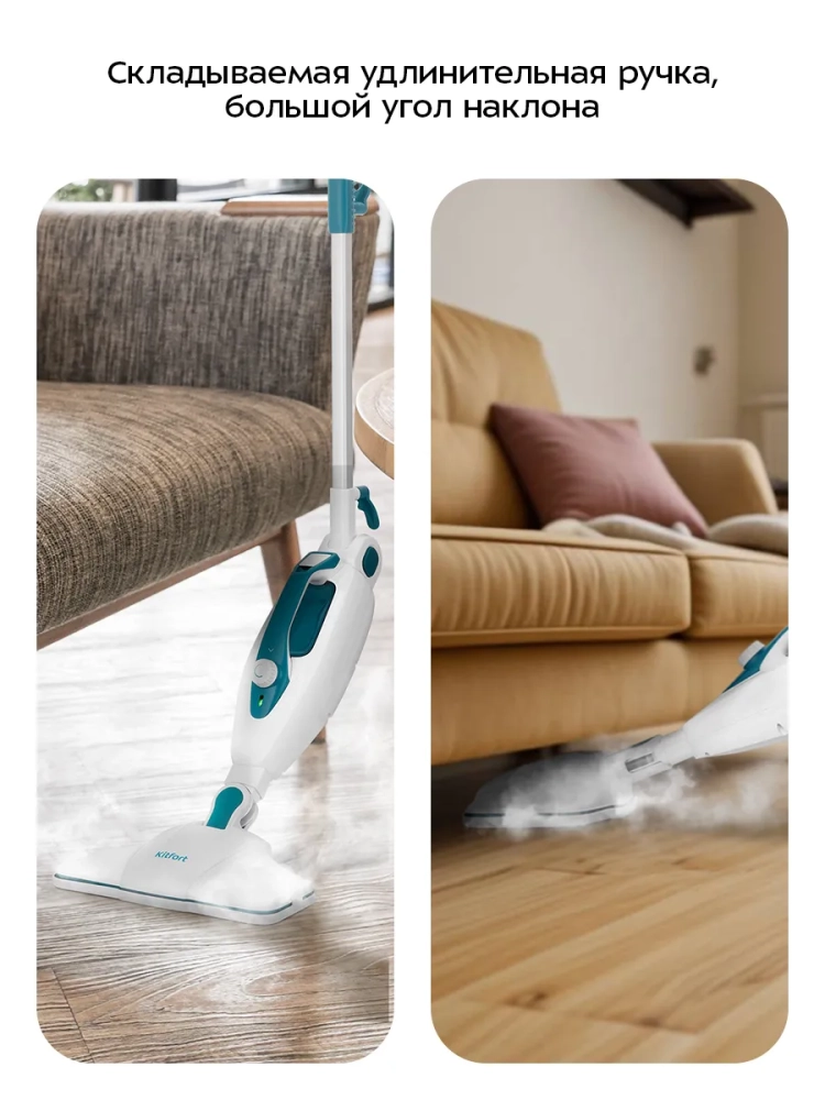 Паровая швабра Kitfort КТ-1080 — универсальное устройство, которое поможет избавиться от пыли и грязи с помощью мощной струи пара, а также продезинфицирует обрабатываемую поверхность. Паровая швабра очистит раковину и плиту на кухне, зеркала и мебель без каких-либо химических средств, исключительно паром.