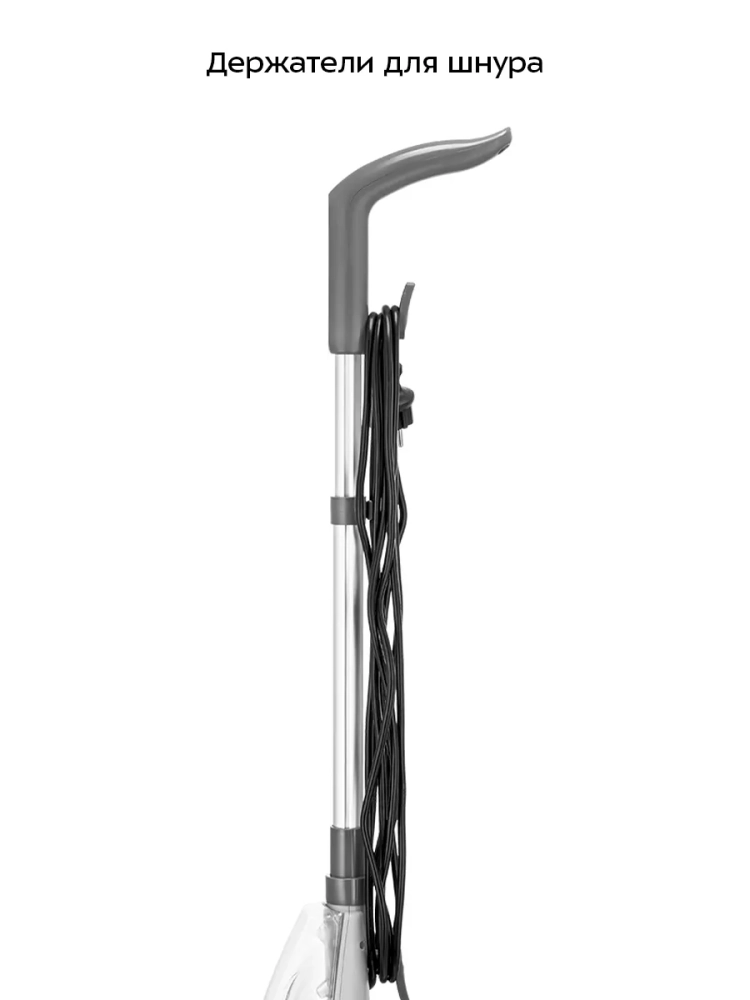 Паровая швабра обладает функцией вертикальной парковки и большим углом наклона, который поможет убрать пространство под мебелью. В комплекте есть рамка для ковра, обеспечивающая легкое скольжение напольной насадки по ковру. Напольная насадка закреплена на специальном шаровом шарнире, который делает швабру маневренной и облегчает процесс уборки. Телескопическая удлинительная трубка позволяет регулировать ее длину, как вам удобно. В устройстве предусмотрены держатели и зажим для шнура. Для компактного хранения удлинительную ручку и напольную насадку можно снять.