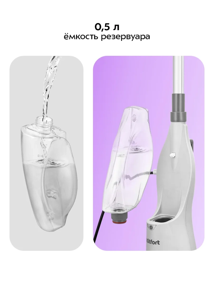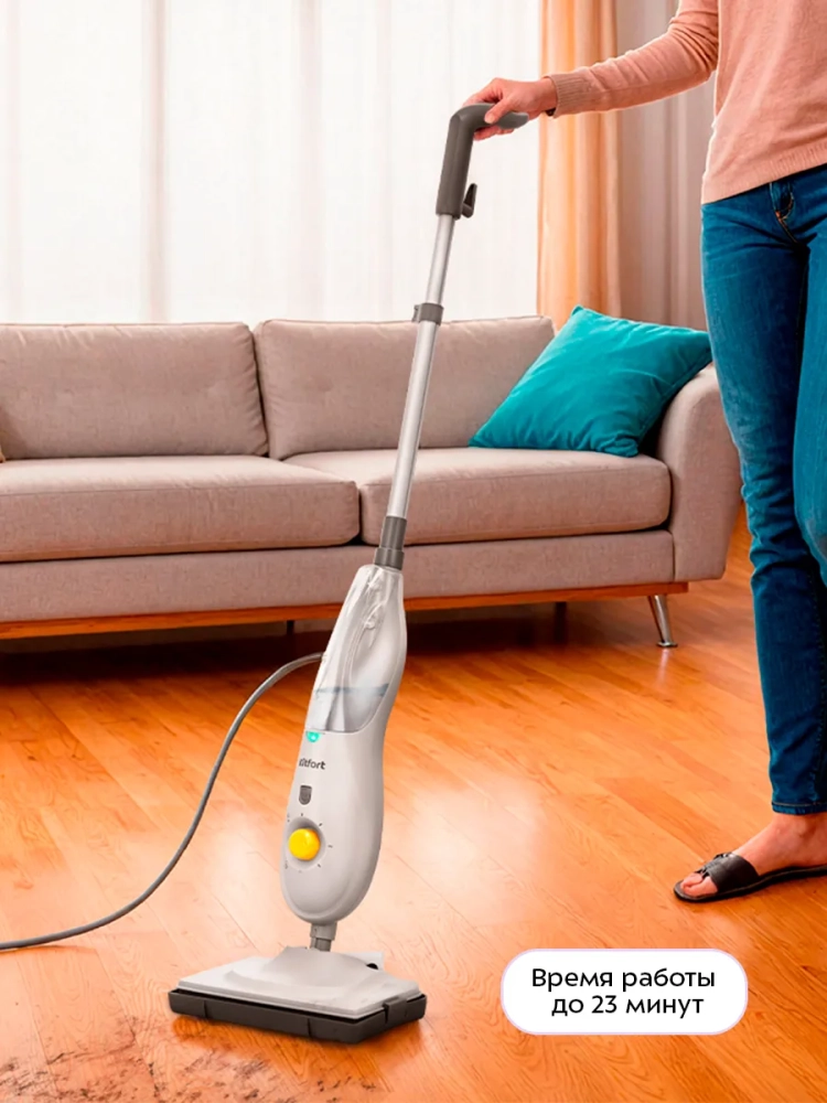 Устройство оснащено съемным резервуаром для воды емкостью 500 мл, что позволяет производить непрерывную уборку до 15–23 минут в зависимости от интенсивности выходящего пара. Регулятор подачи пара позволяет плавно настраивать интенсивность выходящего пара. Чем сильнее загрязнение, тем больше пара потребуется.
