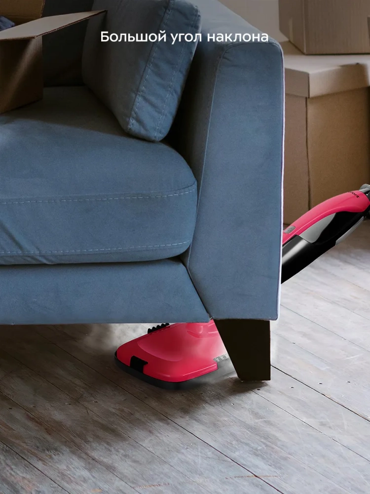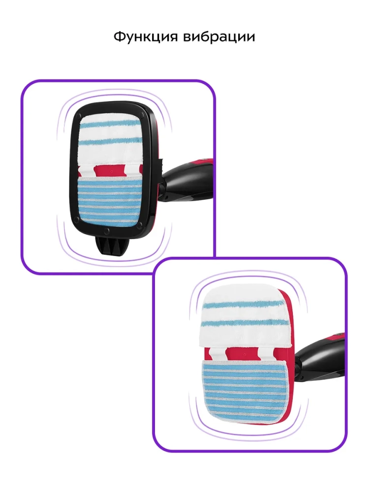 В данной модели тряпки для пола крепятся на две вибрационные платформы. Частота вибраций составляет 6000 ±10% колебаний в минуту. Вибрации во время работы вместе с высокой температурой пара ускоряют процесс очистки. Вы можете не использовать функцию вибрации, включив только подачу пара, или использовать только вибрации для полировки очищенной поверхности. Управление осуществляется двумя кнопками.