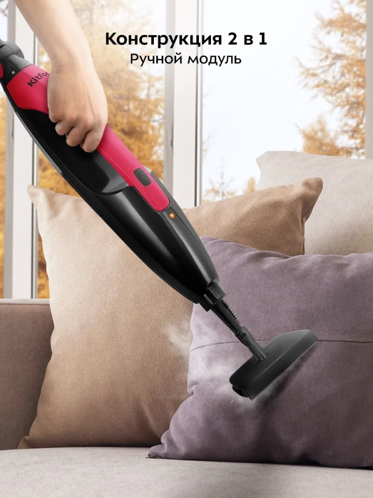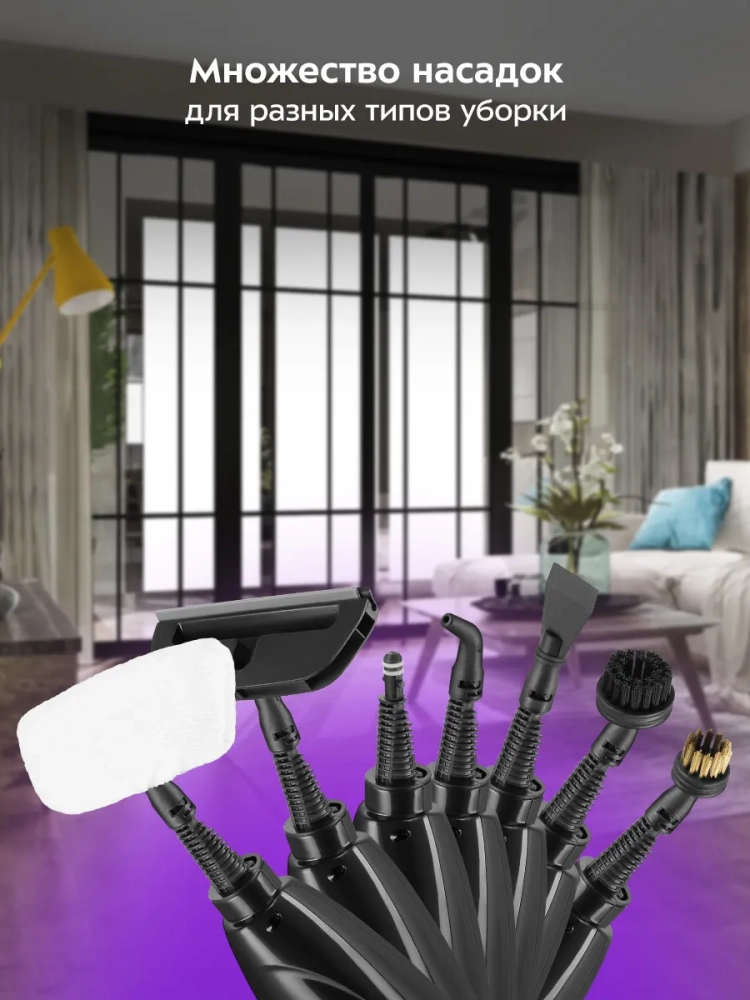 Конструкция «2 в 1» предусматривает использование ручного модуля паровой швабры с насадками без присоединения к нему удлинительной ручки. Большое количество насадок в комплекте поможет очистить труднодоступные или сильнозагрязненные поверхности. Угловая насадка поможет очистить щели и углы. Скребок, латунная и нейлоновая щетки эффективно очищают сложные загрязнения с помощью механического воздействия. Для очистки окон, зеркал и кафельной плитки используется насадка с резиновым скребком. Если на данную насадку надеть тряпку для отпаривания, насадка может использоваться для отпаривания одежды и чистки обивки мягкой мебели.