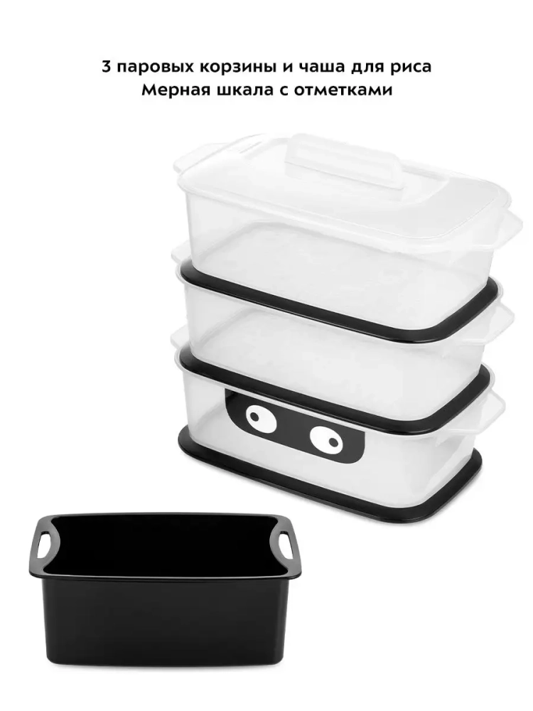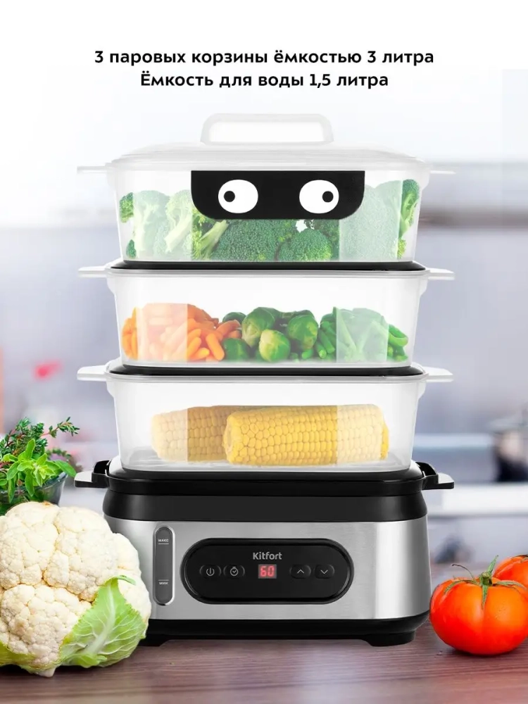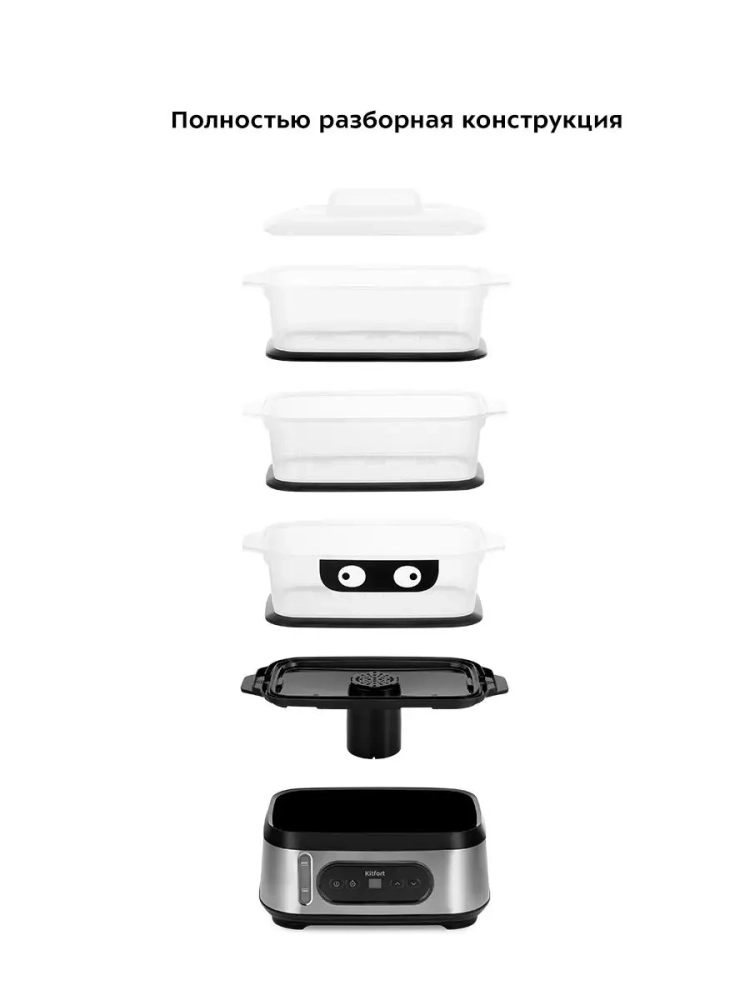 Пароварка оснащена тремя паровыми корзинами, что позволит приготовить обед или ужин из нескольких блюд сразу на всю семью. При этом пароварка достаточно компактная и не займет много места на кухонном столе.