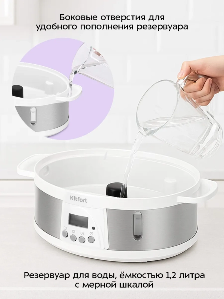Пароварка Kitfort КТ-6922 приготовит вам вкусные и питательные блюда, сохранив все полезные витамины и микроэлементы, содержащиеся в продуктах. Приготовленные в пароварке продукты получаются нежными, мягкими и сочными. Пароварка станет надежным помощником для всех, кто питается диетическими блюдами и просто заботится о правильности своего питания.