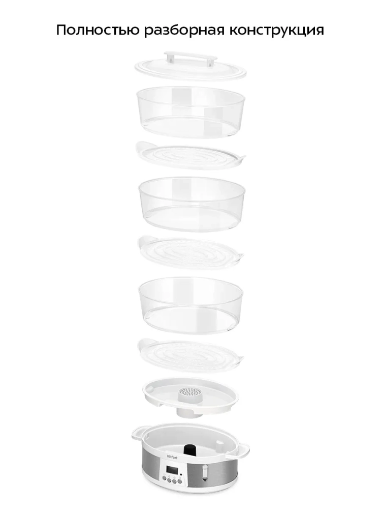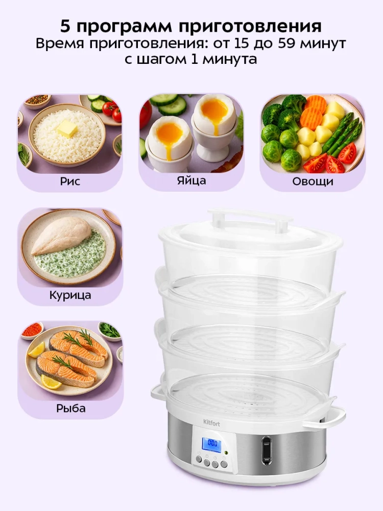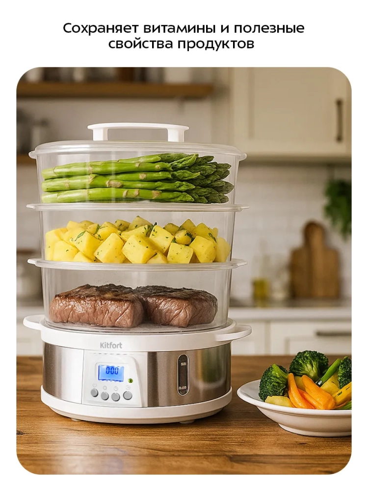 Одно из основных преимуществ пароварки — это возможность готовить сразу несколько типов продуктов, например гарнир и мясо, что уменьшает время, проведенное на кухне. С пароваркой КТ-6922 вы получите полезные блюда с минимумом усилий.