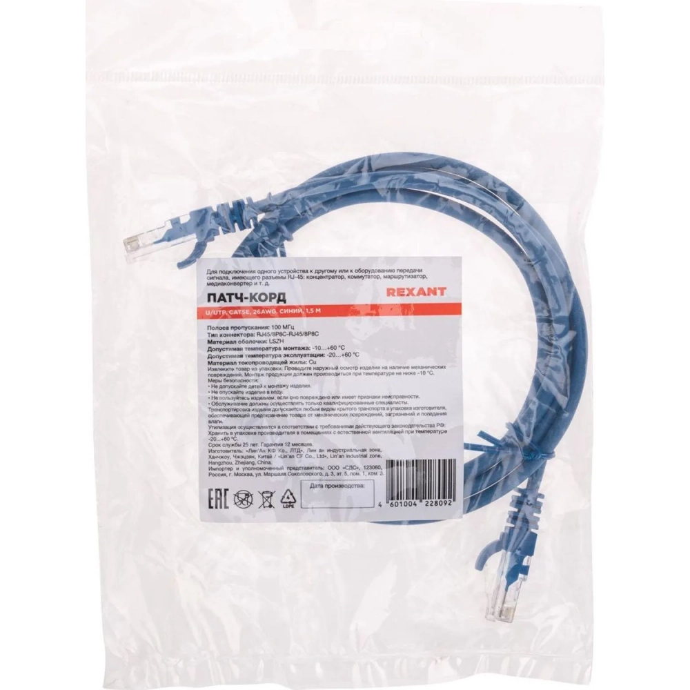 Патч-корд REXANT (02-0104-105) U/UTP, CAT 5e, 26AWG, LSZH, синий, 1,5м