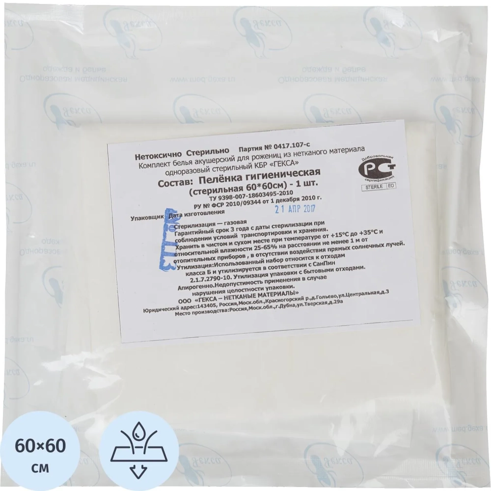 Пелёнка впитывающая гигиен стерил. 60х60 из нетканого материала Гекса