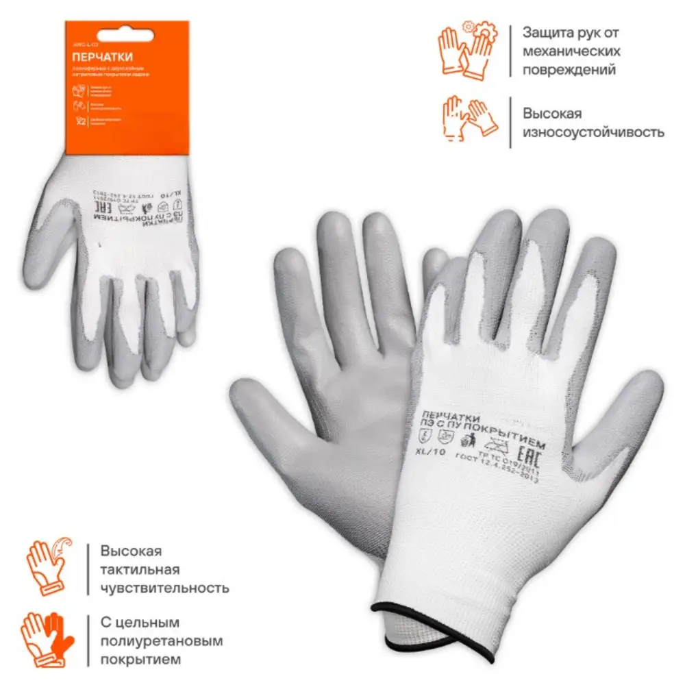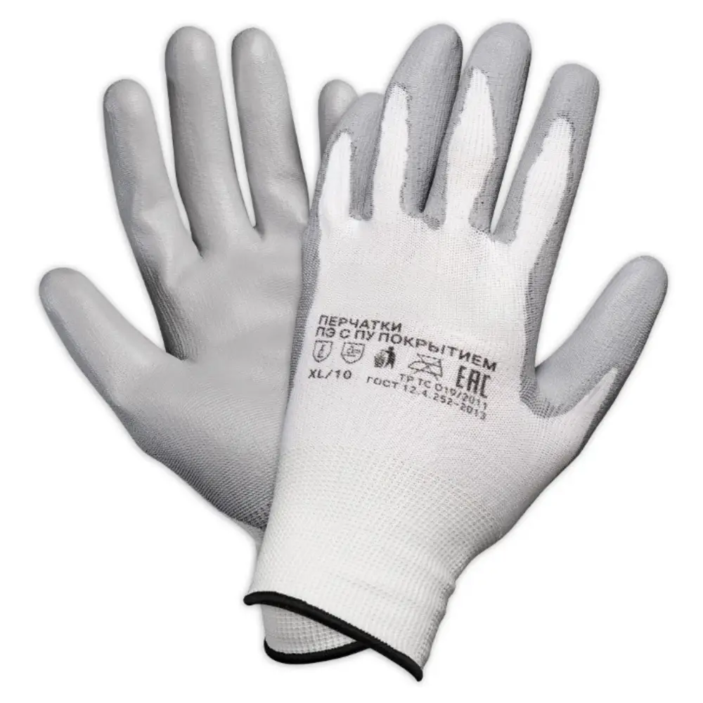 Применяются для защиты кистей рук от загрязнения, механических повреждений. Полиэфирные перчатки отличаются не только высокими показателями прочности, но и особой структурой ткани, которая дает возможность оставаться пальцам чувствительными. Перчатки подойдут для работы с малогабаритными деталями и мелкими механизмами. Перчатки изготовлены из белого тонкого полиэфира схожего с нейлоном и пропитаны полиуретаном серого цвета в области ладони и пальцев. Используются в быту и на производстве требующем высокой точности движений.