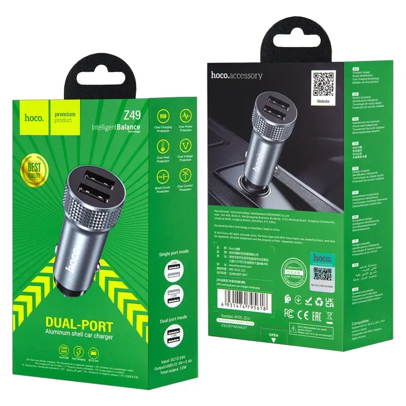 Переходник автомобильного зарядного устройства на 2 USB 2.4A Z49 HOCO серый