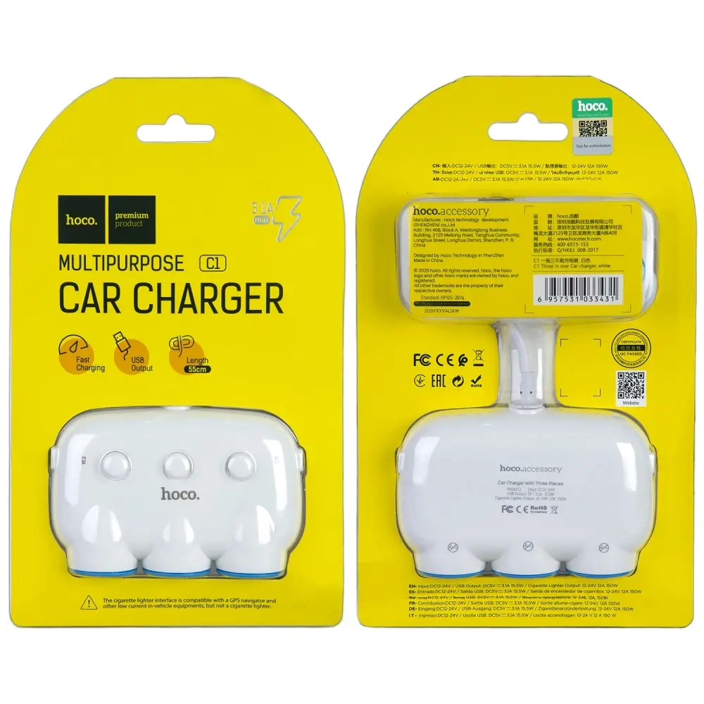 Переходник C1 АЗУ на 2 USB + 3 прикуривателя 3.1A HOCO белый